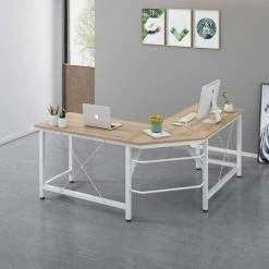MERIDEN FURNITURE Cherry Tree Furniture Large L-Shaped Corner Desk Computer Workstation 150×150 X73 Cm (Wood & White Frame)