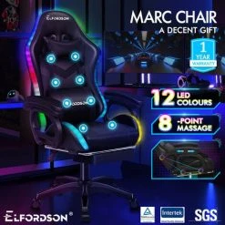 ELFORDSON Gaming Chair With RGB LED Light 8-Point Massage, Black