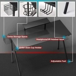 COSTWAY Multifunctional Gaming Computer Desk, Ergonomic Computer Table Includes Raised Shelf, Cable Management Grommet, Headphone Hook, Cup Holder, K-shaped Computer Table For Bedroom, Study