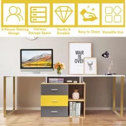 This extra-large computer desk is everything you’d expect from a two-person workstation. The spacious tabletop provides ample room for multiple monitors, laptop setups and other office supplies, making the desk an ideal workstation for 2 users. You can sit with your partner side by side to play games or do cooperation work. If you are limited in space and want to use the writing desk alone, you can install it in an L-shape to fit the room’s corner. And you can stow away books, files and decorations into the storage cabinet under the desk, which is composed of 3 large drawers and 3 open shelves. Stability is also a major feature of the computer desk, since it is designed with a sturdy steel frame and a large cabinet as support. What’s more, the computer desk is stylish in look and practical in use. It is a best choice for homes, offices and dorms. Note: Please assemble with just a Philips head screwdriver (not included), and the power tools are not recommended.