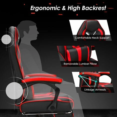 Supported by a heavy duty base with a high quality gas rod, this armchair is sturdy and stable enough to support up to 120kg. Ergonomic design perfectly conforms to the curve of the body to achieve optimal comfort. You will sit comfortably and feel relaxed with high backrest, USB massage lumbar pillow, retractable footrest and thick padded cushion. The smooth PVC surface is easy to clean while bringing you a skin-friendly touch. Besides, the seat height and backrest can be easily adjusted to meet your ideal position. This racing chair can not only improve your gaming experiences, but also serve as a comfortable computer chair for your daily work or study.