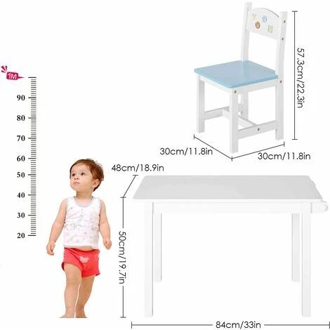 - Table size: 84 x 48 x 50 cm. Chair size: 30 x 30 x 57.3 cm. The maximum load capacity of the children’s chair is approximately 36 kg. Age recommendation: children from 3 to 8 years old.