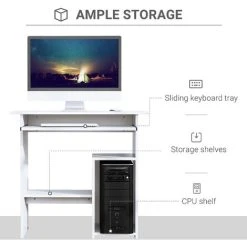This compact computer desk is a simple but extremely useful addition for the home desk is spacious enough to carry work out peacefully. Made from thick particle board in a fresh finish, this sturdy and durable piece is crafted into a design which features a slide-out keyboard tray, CPU stand, two open storage shelves and a large worktop. Smooth on top, the non-scratch melamine surface is easy to clean and maintain, making it perfect for busy lifestyles. Specifications: