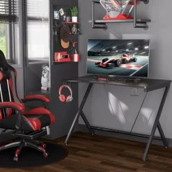Make your gaming time extra fun with this HOMCOM stylish PC desk for gaming. It features a large main worktop, a cup holder and a headphone hanging hook, giving you everything you need in a spacious spot – meaning you won’t have to move in the midst of a game. The adjustable feet ensure the gaming PC desk keeping level at all times. The perfect piece for your home gaming haven. Specifications: