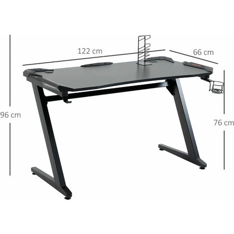 • Dimensions: 96H x 122L x 66Wcm. Tabletop to floor: 76cm. Distance between legs: 115cm. Cup holder: 6H x Φ11cm. Gamepad holder: 20H x 8.5W x 12Dcm