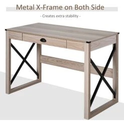 Have all the hard work done for you with this ultra-stylish computer table from HOMCOM. A premium particle board construction to ensure the frame is reliable and steady as you work, with a steel ‘x’ section on both ends which help keep the legs in shape. A large clearance under the study desk allow plenty of room for your legs, with a drawer for convenient storage. The large desk provides plenty of space to work. It’s finished with a metal drawer handle and metal corner edges. Specifications: