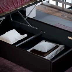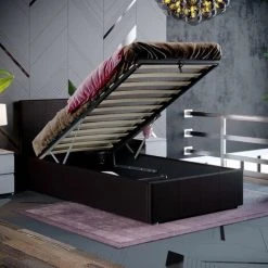 Home Discount offers this stunning new product with a modern stylish design, the Lisbon Single Ottoman Faux Leather Bed. This stunning bed frame is made from sturdy plywood. Unlike solid wood, which is strong only across the grain, plywood is tough regardless of directional force, making it very good at resisting sharp blows and wear and tear. This gorgeous ottoman bed when lifted offers a plenty of storage for that seasonal clothing you don`t know where to put. Fitting a standard single size mattress this bed frame is perfect for singletons. With its shiny and textured appearance, this faux leather bed frame would look fantastic in any room interior, giving your bedroom a feeling of warmth and opulence.