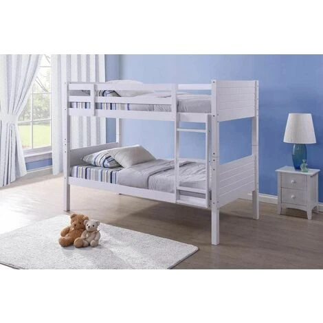 – White wooden bunk bed in a light antique finish. Wood slatted base.