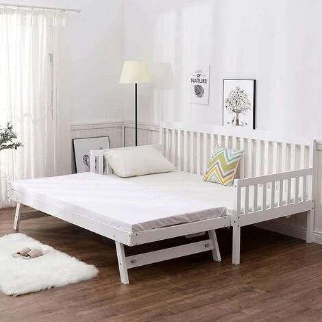 Pine wood white finish bed with under bed trundle A pull out underbed trundle which can be raised to the same level as the daybed