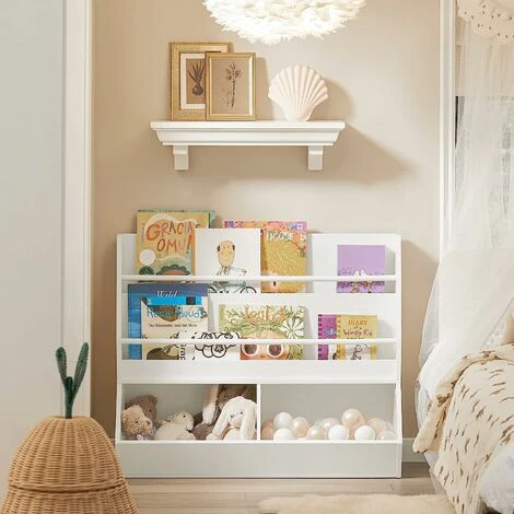 Modern design children storage shelf will blend perfectly with any decor. It will keep the room nicely organized.