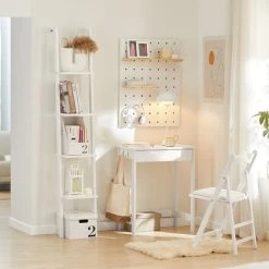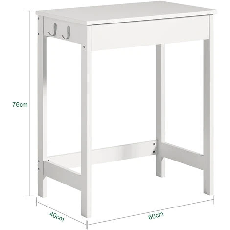 | Large desk area so you can have more than enough room for your computer or reading material. | 1 drawer for storing anything you might need in reach. | 2 hooks on the right hand side, offering extra storage space and keeping the desk tidy and organized. |
