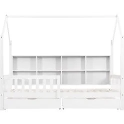 Multifunction This Scandinavian-style cabinet combines storage and bed functions. The house shape of this toddler bed has a storage area on the back for books, toys and small items. This cot also has two large drawers to store unused items under the bed. The functional design of this product is thoughtful and very practical.