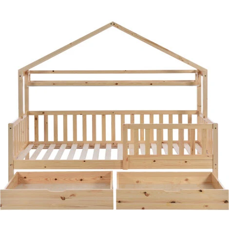 Dieses Hausbett mit Schubladen zeichnet sich durch einfarbiges, minimalistisches Design und natürliches Holzmaterial aus. Dieser skandinavische Stil betont sowohl die funktionale Funktion der Möbel als auch das menschliche Element im Design. Es gibt keine komplizierten, überflüssigen Muster und dekorativen Designs, wodurch eine entspannte, natürliche und ruhige Atmosphäre entsteht.