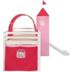 This princess-themed children’s loft bed will be a real eye-catcher in your kid’s bedroom. The loft bed has a solid construction and is delivered with the bed slats, a slide, a ladder, and a princess-themed tent, side covers and a canopy. Guard rails on both bed edges will keep your little princess in the bunk. The space underneath the bed transforms into the princess’s dress room with the included sidewalls with windows. Additionally, the loft bed is distinguished by an entertaining slide and a ladder, both of which can be covered with the included tent. The slide and the ladder can be assembled either on the left or right, and a canopy for covering the bed is also included. The bed is suitable for 90 x 200 cm mattress. Your little one will love sleeping and playing in this dream space! Please note that the mattress is not included in the delivery.