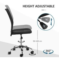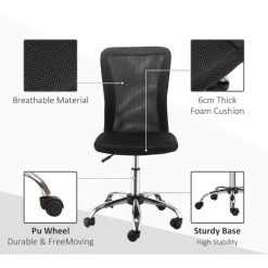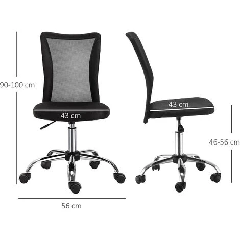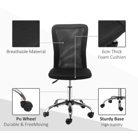the mesh back is breathable. The slightly curved back offers support as you lean back. A steel base for weighted balance, with five wheels to move around easily. No arms means this swivel chair fits underneath your desk at any height. A compact design is ideal for small places.