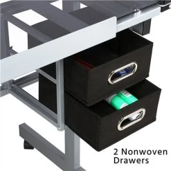 This angle-adjustable drafting table is definitely what you want. The stylish drafting table is crafted of a powder-coated steel frame and tempered glass desktop. The adjustable desktop angle can be easily adjusted from 0 to 60°to meet your needs and drawing habits. Smooth glass edges and rounded corners can avoid undesired injury or damage. The two fabric drawers and four side stationery trays provide ample stationery storage space. This rolling drawing station can be used as a light table, drawing table, computer table, or writing table.