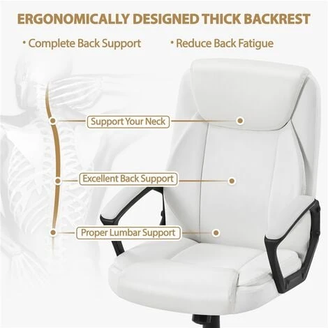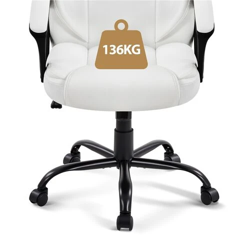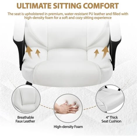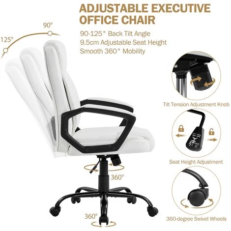 This appealing faux leather computer chair checks all the boxes. The combination of smooth faux leather texture and matte black base will give your workspace a more upscale appearance. A durable steady frame makes sure our customers enjoy comforts and relaxing sitting. The seat height is adjustable according to personal preference. The foam-padded seat and high back provide optimal body support and relieve muscle tension caused by long hours of working, meeting, or studying. It has a rocking feature as well. Mute castors allow 360° smooth mobility without scratching the floor. A versatile addition to study rooms, offices, home offices, reception areas and libraries.